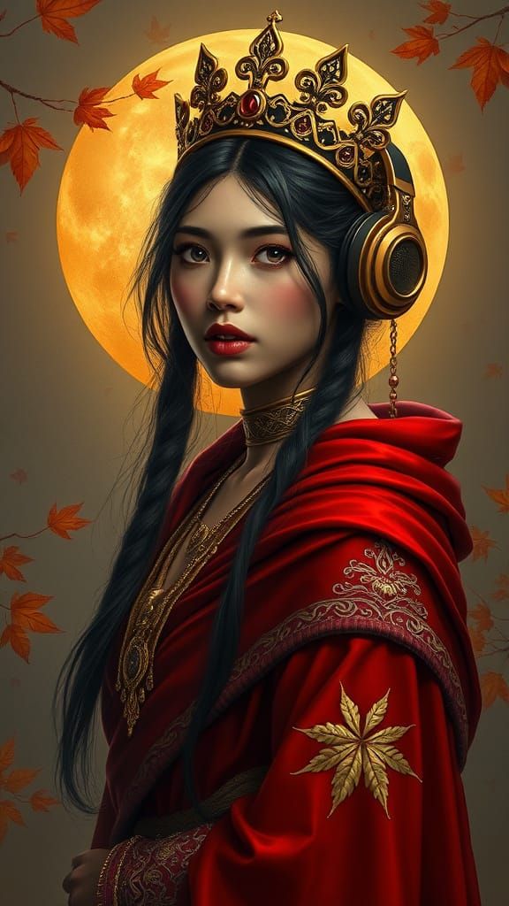 This image depicts a young woman with Eastern and European features, surrounded by opulent golden accessories and a crimson cloak, set against a serene autumnal backdrop with a golden moon and stylized leaves, evoking a sense of depth and drama reminiscent of hyperrealistic fantasy art.