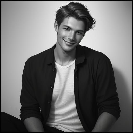 This image shows a smiling young man sitting in warm light, his gaze drifting between highlights and shadows. The black and white image has film grain, high contrast and cinematic artistic detail.