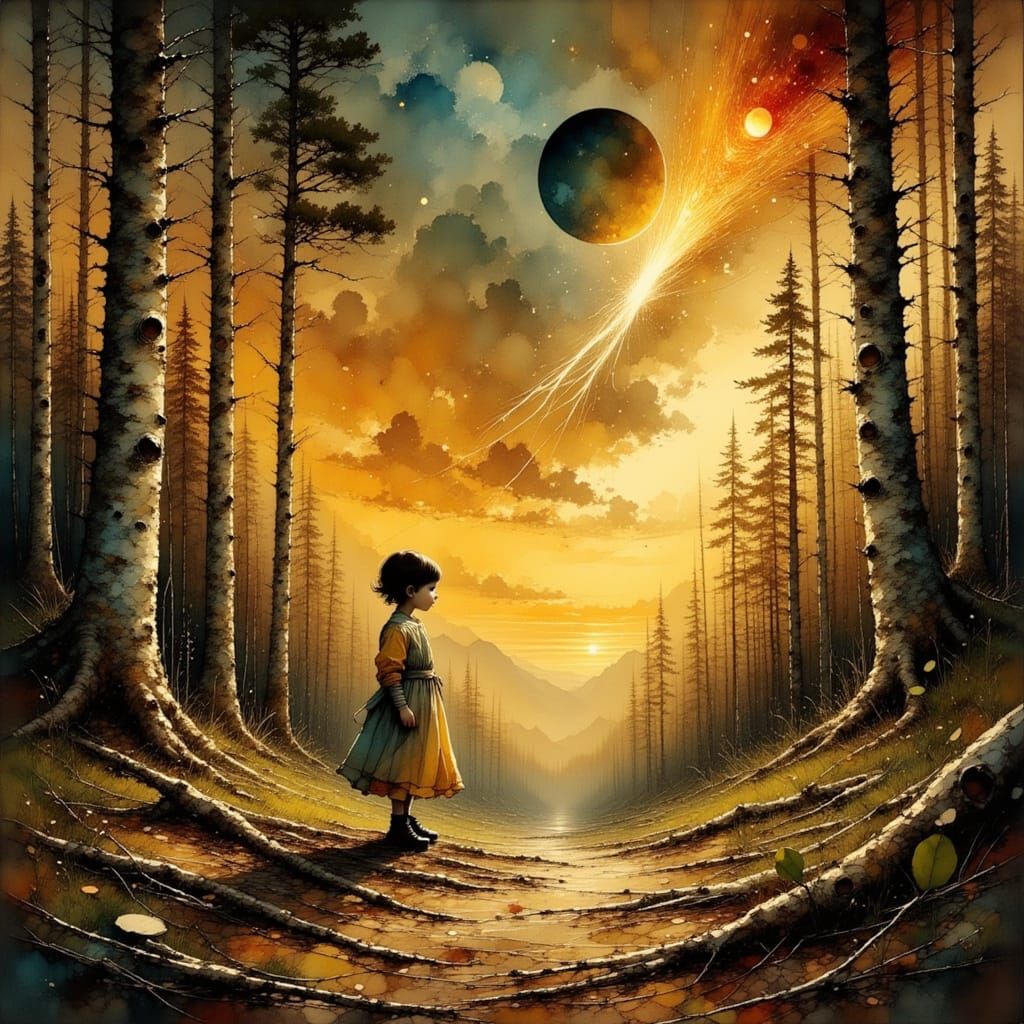 <lora:Ink Poet:1.0> <lora:Akimora:1.0> A small child stands in a forest clearing and admires God’s handiwork. Suddenly a very large fiery meteor comes screaming down from the sky and lands right on top of the child!!! A blinding flash overpowers the viewer. The flash fades and all that’s left is a ...