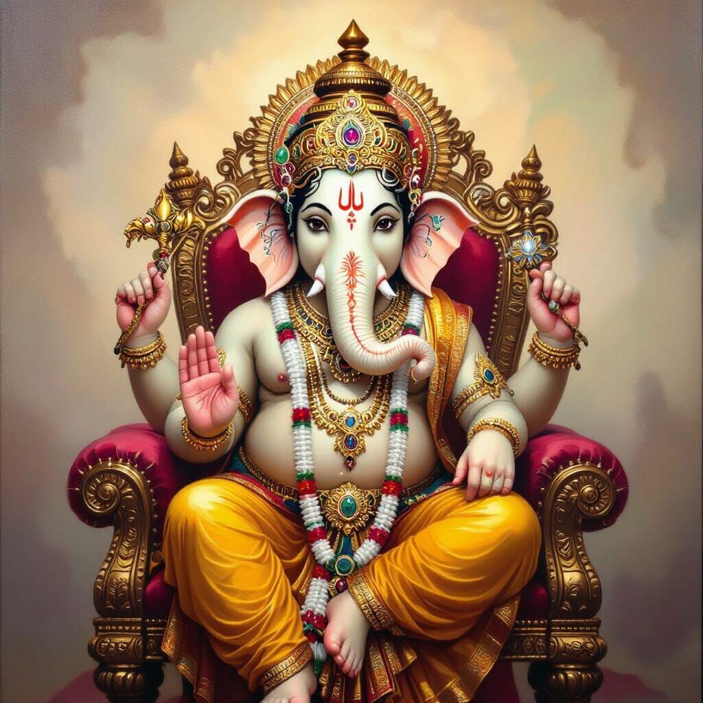 A majestic depiction of Lord Ganesha on a throne. The artwork features rich jewels and golden ornaments against a glowing backdrop, reminiscent of classical Indian paintings with textured oil on canvas.