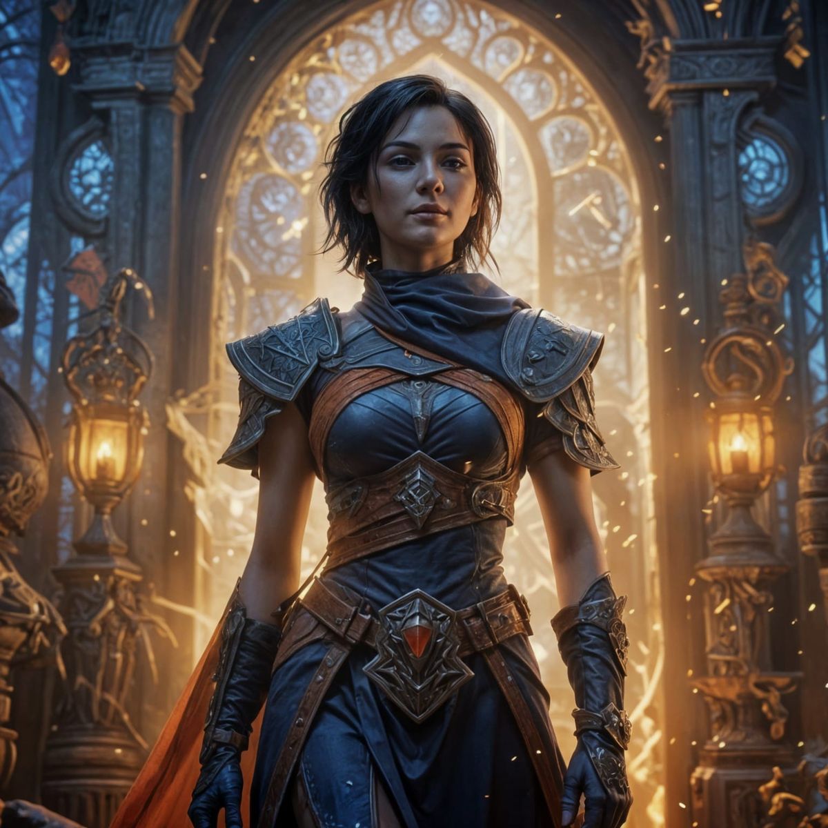 This image features a confident priestess, Althea Starblessed, in an occult doorway. The vivid scene is rendered as detailed fantasy art with cinematic lighting and rich colors, reminiscent of Warhammer 40k.