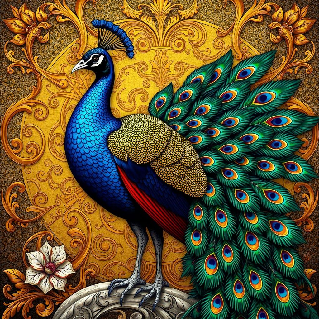 A vibrant image showcasing a peacock with iridescent feathers and baroque influences. The gilded background features swirling floral patterns, reminiscent of Art Nouveau.