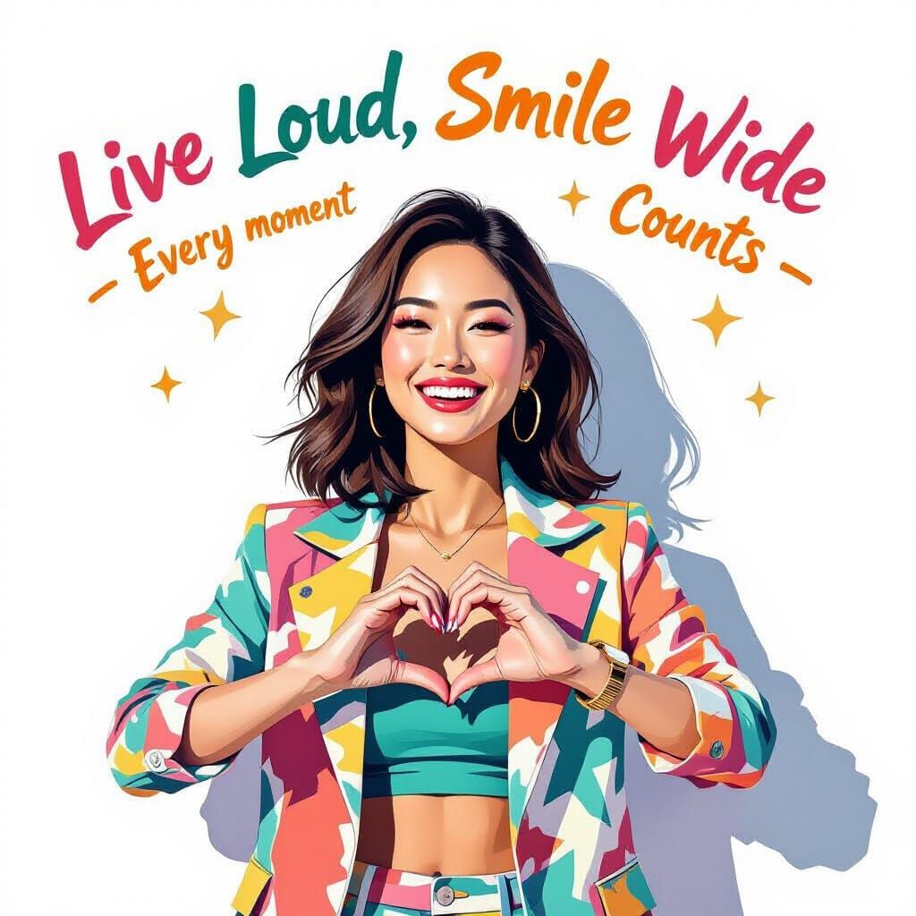 This oil painting shows a smiling Asian woman in vibrant streetwear, forming a heart shape. The composition uses bold patterns and warm colors, conveying joy and positivity.