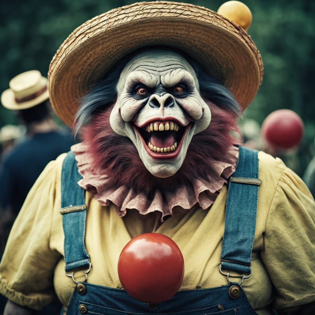 This image depicts a corpulent zombie monkey monster clown female grinning maniacally. She wears overalls and a straw hat in this cinematic, atmospheric film still.