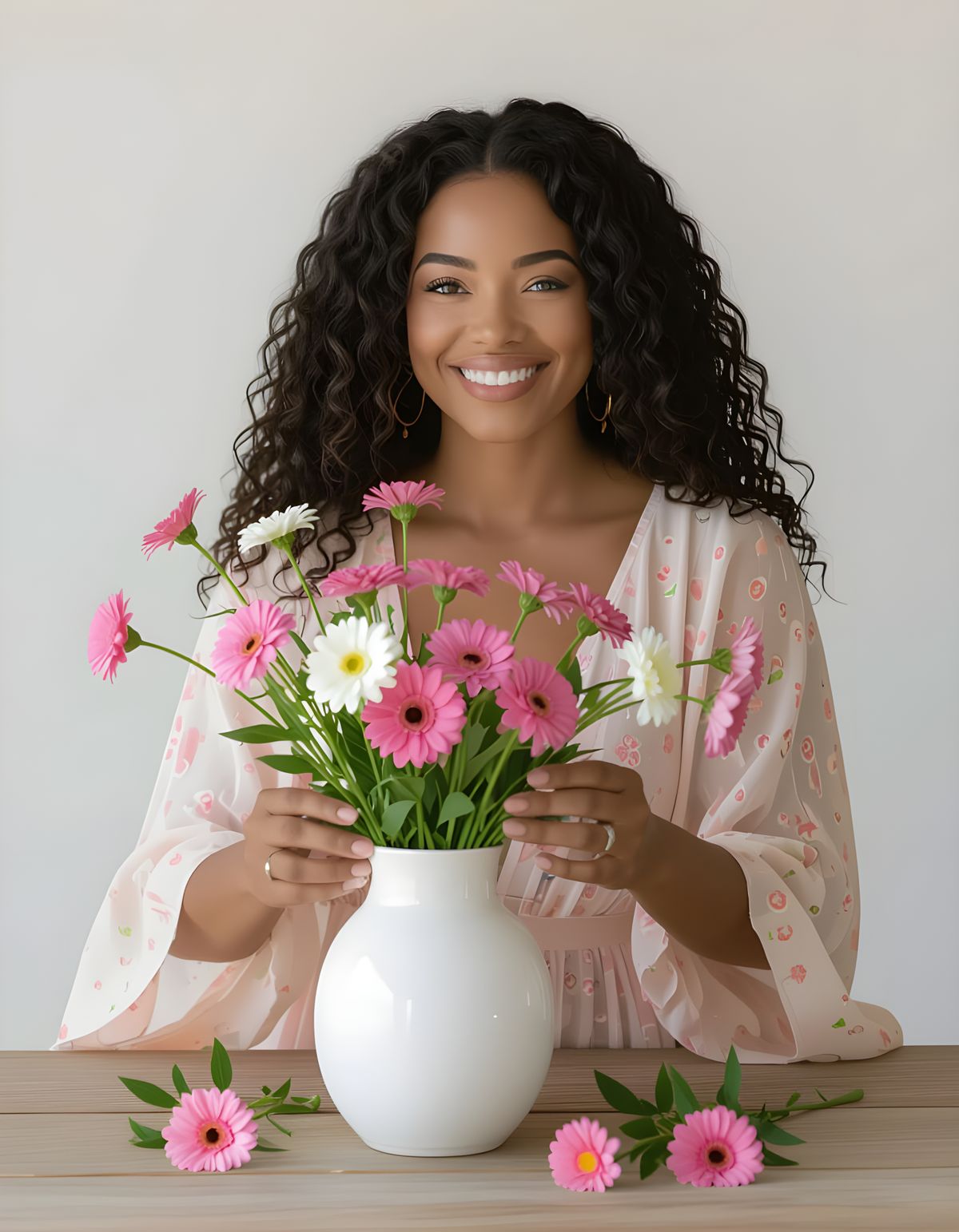 A realistic portrait of the goddess of Icuma, depicted as a Black woman with long, curly hair, arranging flowers in a vase. The image has a soft bokeh and studio lighting.