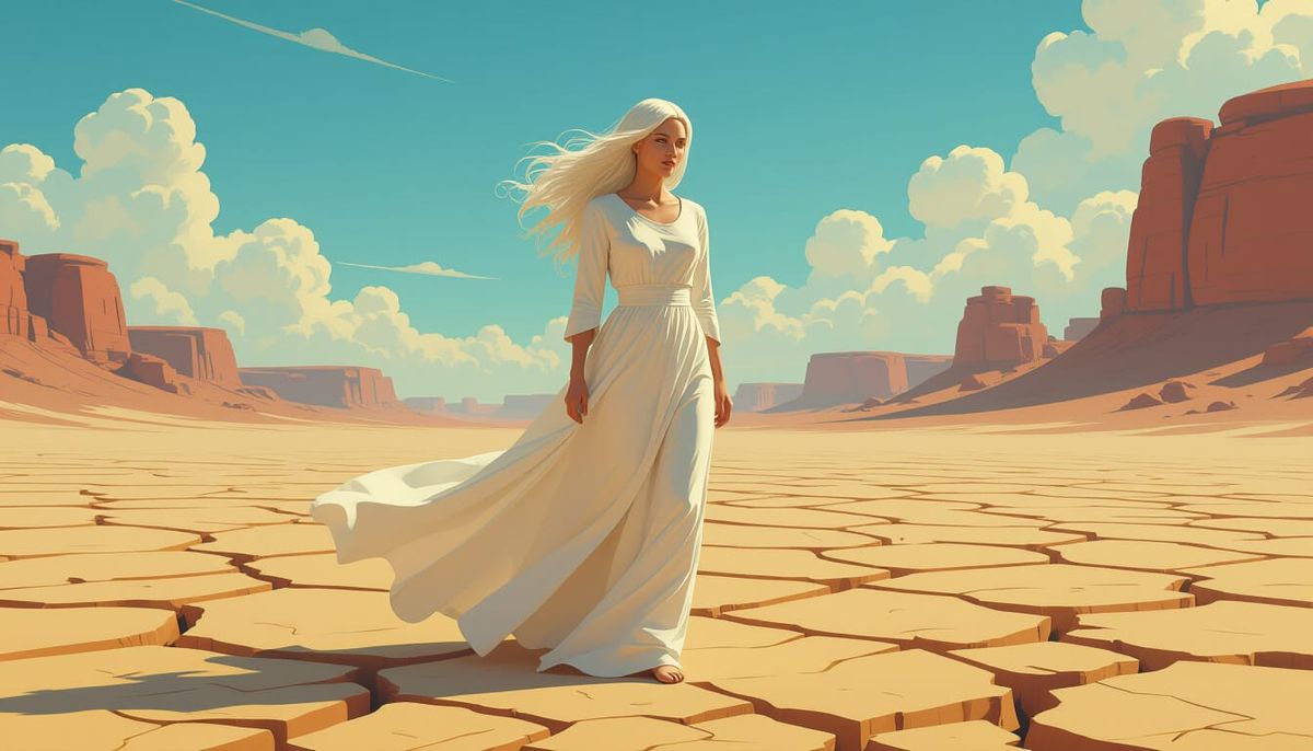 This image depicts a white-haired woman in a flowing white dress on a barren, cracking landscape. It blends dystopian, vibrant, and mystical artistic elements for a unique visual.