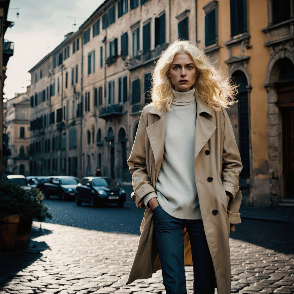 A striking image of a tall, blue-eyed woman with long, dark blond hair, walking on a rainy street in downtown Rome, surrounded by high contrast, deep shadows, and a touch of golden hour, evoking a moody and introspective atmosphere reminiscent of Italian neorealism.