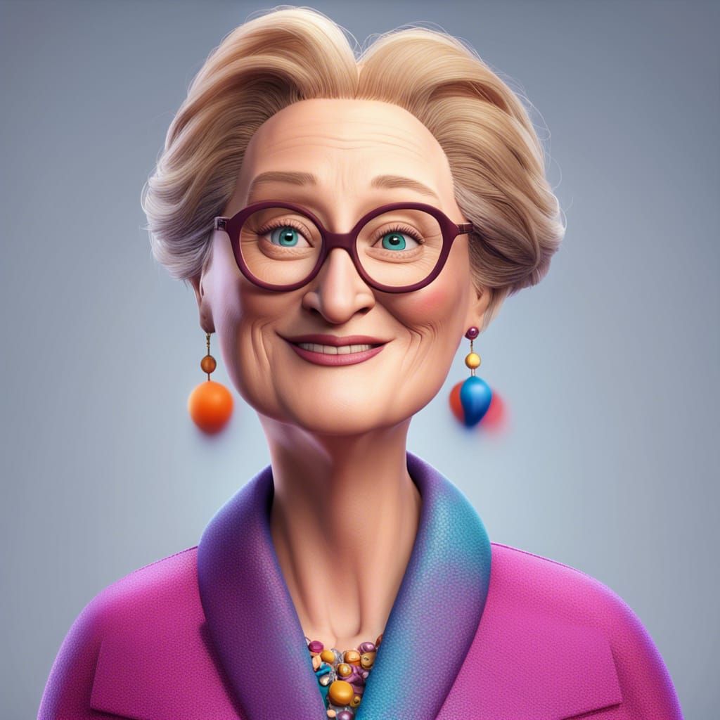 This image shows a 3D digital art rendering of Meryl Streep in a Pixar or Disney-style cartoon aesthetic. The bright, cinematic image uses radial gradients and 3D shading.