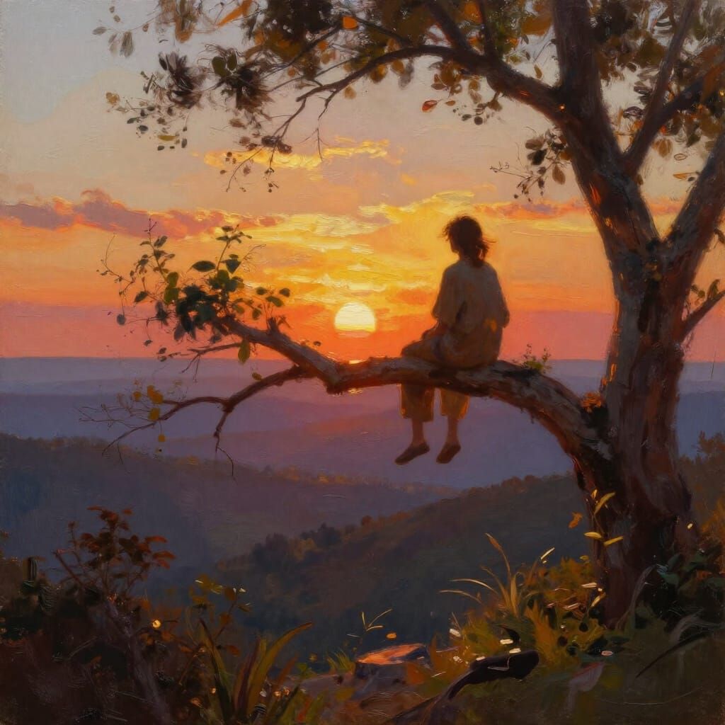 Easily generate unique images of people sitting on branches during sunset. Free and simple AI art creation.