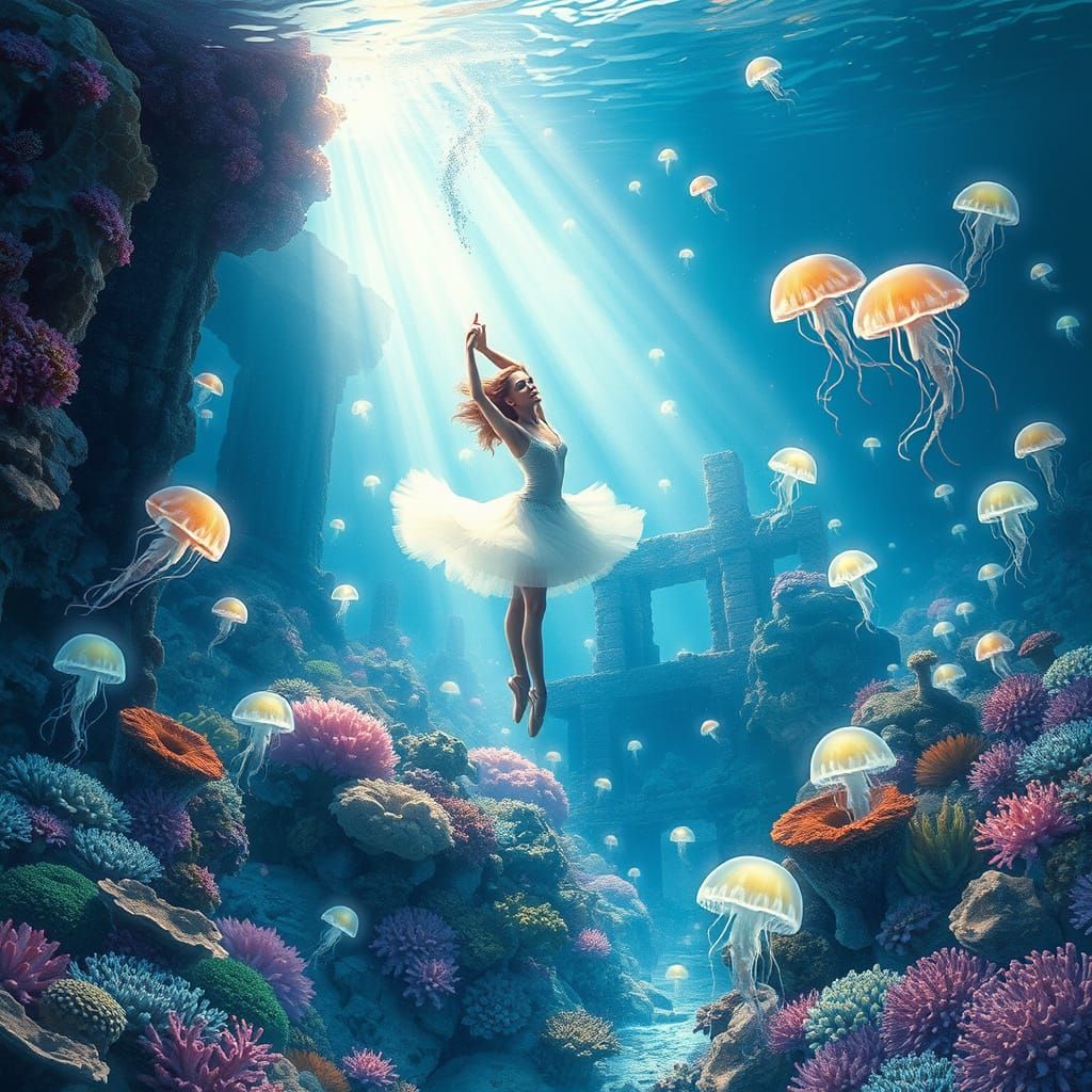An underwater scene depicting a graceful ballet dancer performing amidst a vibrant coral reef teeming with fantastical, bioluminescent jellyfish. Ancient, submerged ruins hint at a lost civilization. The water is crystal clear, illuminated by shafts of sunlight filtering from above. The style is a dreamlike watercolor with soft, blending colors and an ethereal, romantic aesthetic.