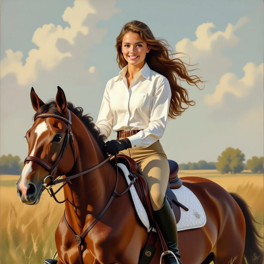 This image shows a young equestrian jumping on horseback in a rural setting. The artwork evokes a sense of freedom and joy, reminiscent of realistic twentieth-century painting.