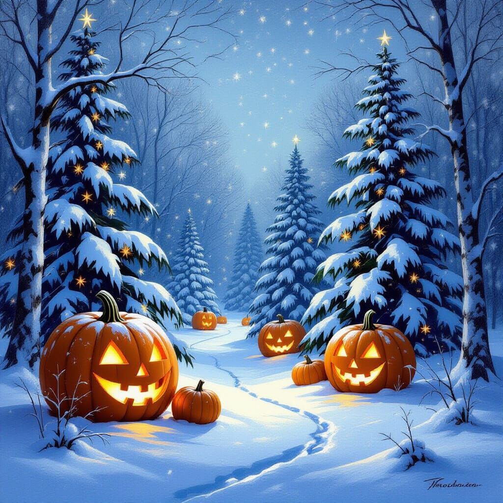 Generate your own whimsical holiday scenes with glowing pumpkins and snowy trees. It's free and easy!