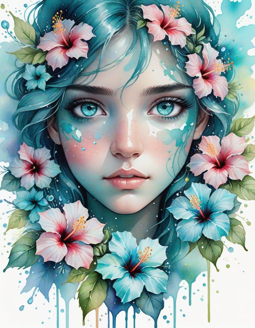 This image shows a macro photograph of aquamarine eyes adorned with hibiscus flowers and light blue bubbles. The artwork is rendered with soft pastel colors in a dreamy expressionist style, resembling watercolor splash art.