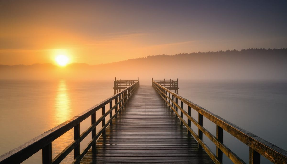 This image depicts a serene seaside pier at sunrise shrouded in mist. The tranquil scene captures the beauty of the coast in the early morning light.