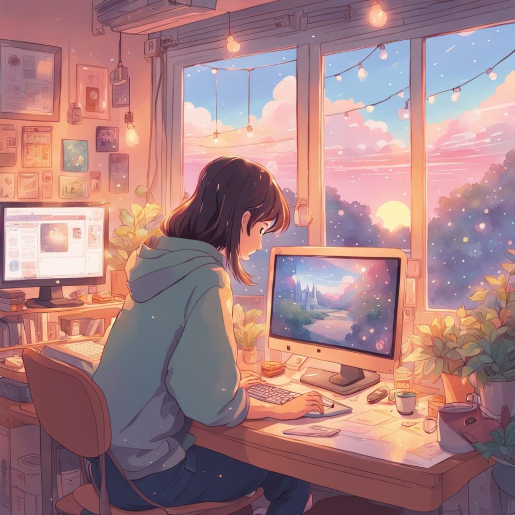 This image shows a pastel-toned concept art of a teenage girl at her desk with a computer. Anime posters adorn the wall, enhanced by warm golden hour lighting, creating a cozy, watercolor-style scene.