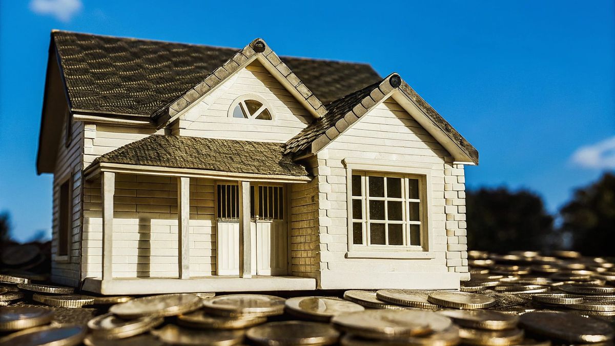 This image showcases a highly detailed house model placed atop a stack of euro coins, set against a crisp white background, reflecting the precision of architectural renderings.
