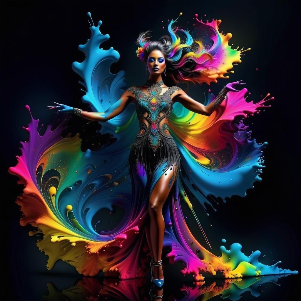 A vibrant image of ink splatters and melting acrylics. The artwork evokes happiness and joy with a neon painted eye, fractal details, and a high contrast, cinematic composition.