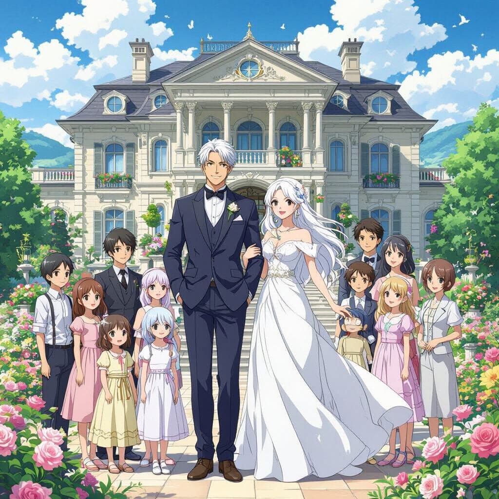 This image shows a smiling man, his white-haired wife, and their children in front of a grand mansion. The image is rendered in a vibrant anime style with intricate details and pastel colors.