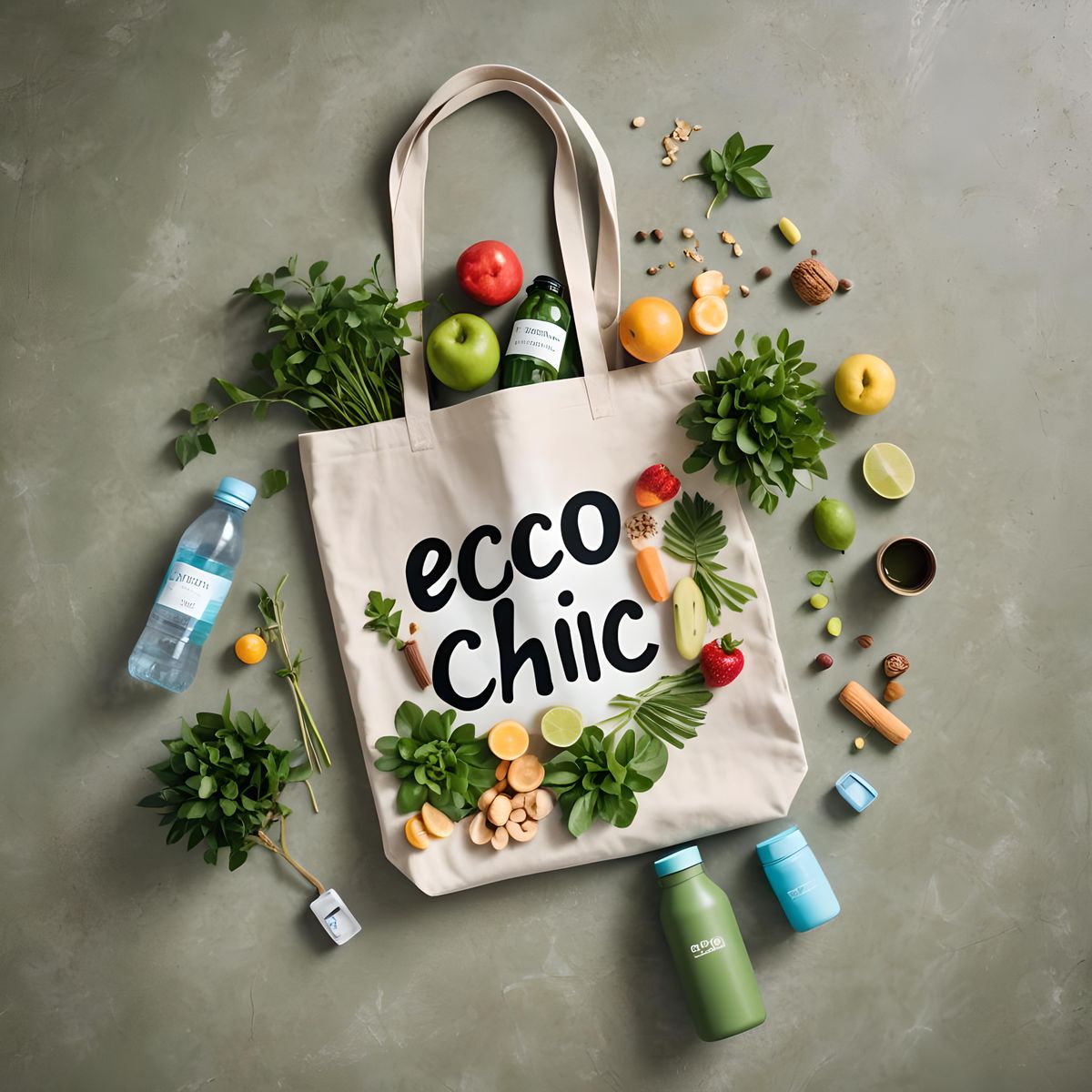 This image shows a flat lay composition featuring an "Eco Chic" canvas tote bag. A reusable water bottle, green plants, and organic snacks are arranged around the bag in a minimalistic flatlay photograph.
