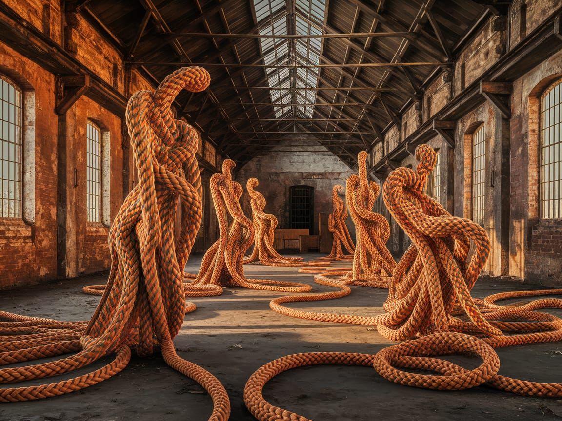 This oil painting captures a surreal warehouse interior bathed in golden hour light. Abstract female figures, intricately formed from rope, weave through the aged space, creating a textured and symbolic masterpiece.