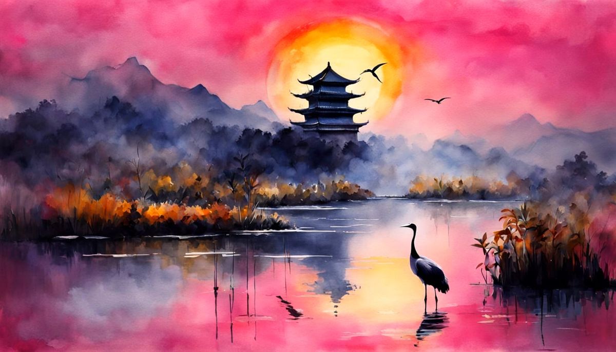 This image shows a black crane silhouette reflected in a pond at sunset. Tall Chinese temples rise in the background, shrouded in fog, with a vivid magenta sky overhead, in watercolor style.