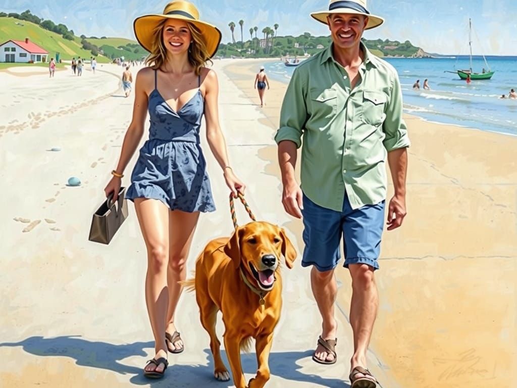 This image shows a woman strolling along a beach in summer clothing. The scene evokes impressionism through soft brushwork and a warm, golden color palette.