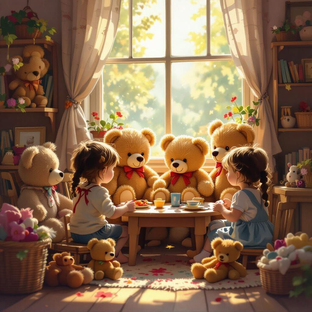 Generate unique teddy bear images with kids viewing them, bathed in sunlight. Free and easy AI image creation.