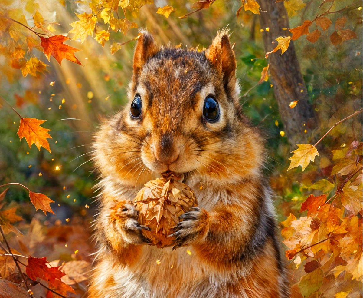 A close-up impasto watercolour oil painting of a fluffy chipmunk intensely focused on eating a walnut. Features warm golden light, autumn forest, and magical sparkles.