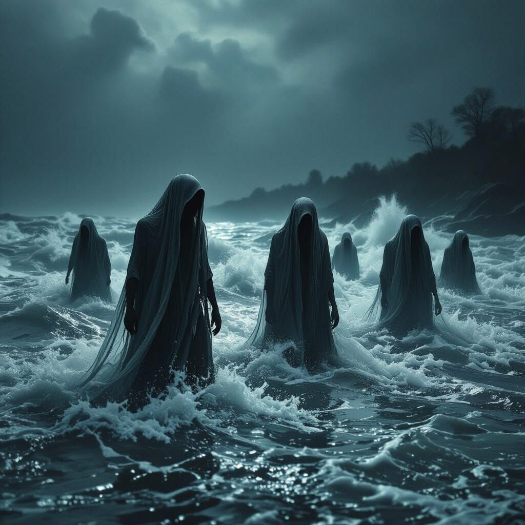 This image shows spectral women rising from a stormy river under the eerie glow of lightning. This digital artwork evokes a dark and mysterious aesthetic.