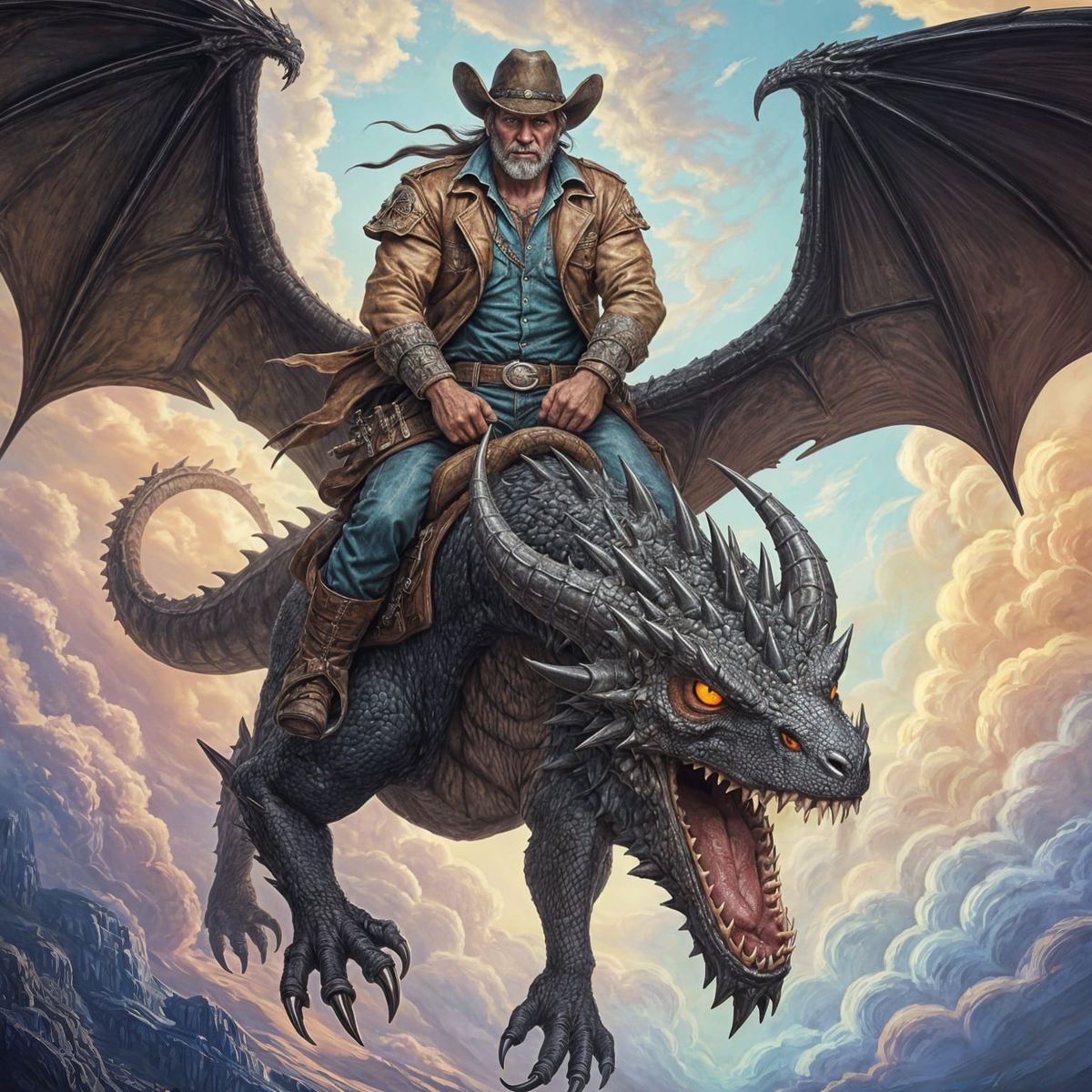 A digital painting of a weathered cowboy heroically riding a dragon. The artwork captures a fantasy scene with detailed textures and dramatic lighting.