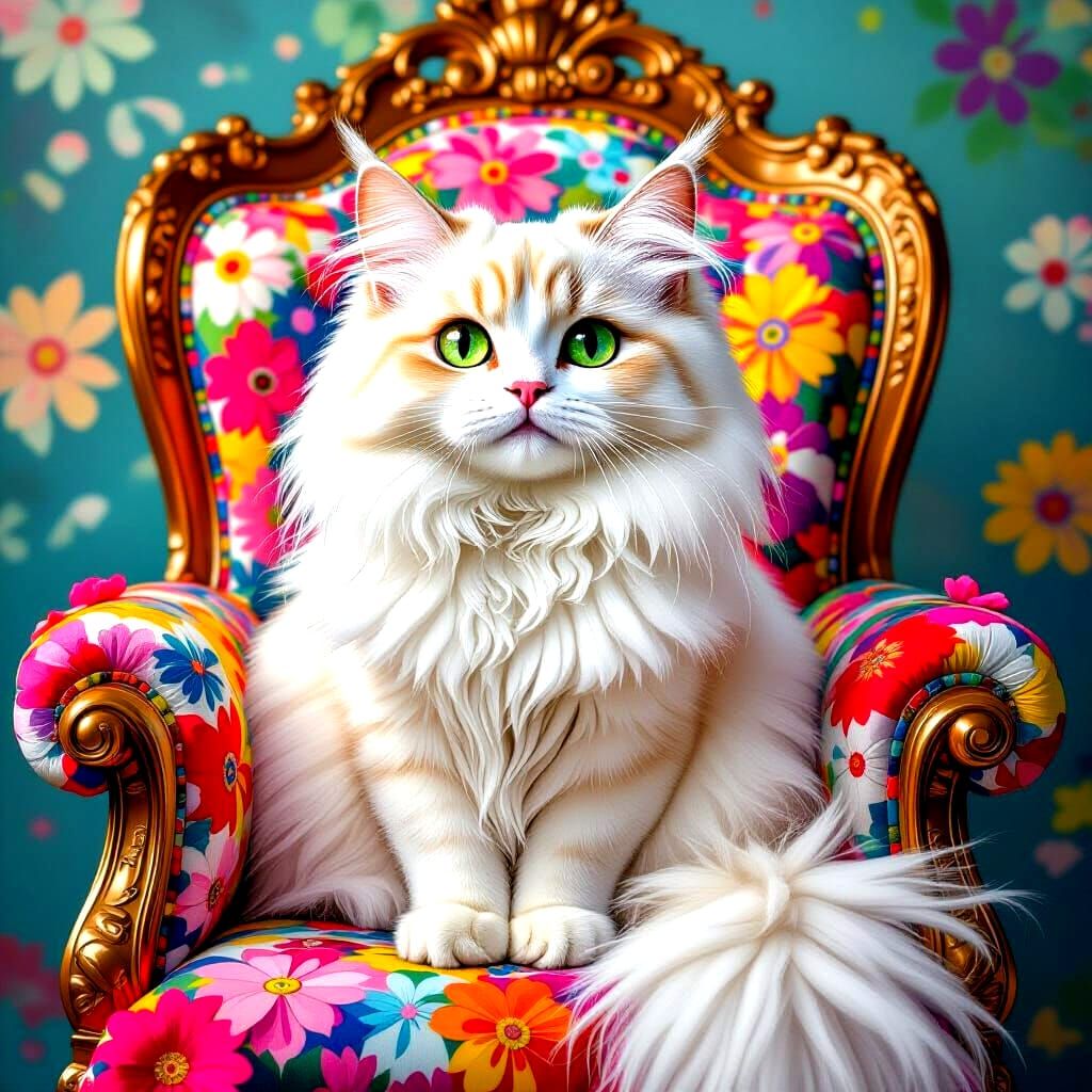 This image shows a fluffy white cat with long eyelashes and big green eyes sitting regally on a throne of colorful flowers. The artwork is in a vivid pop art style.