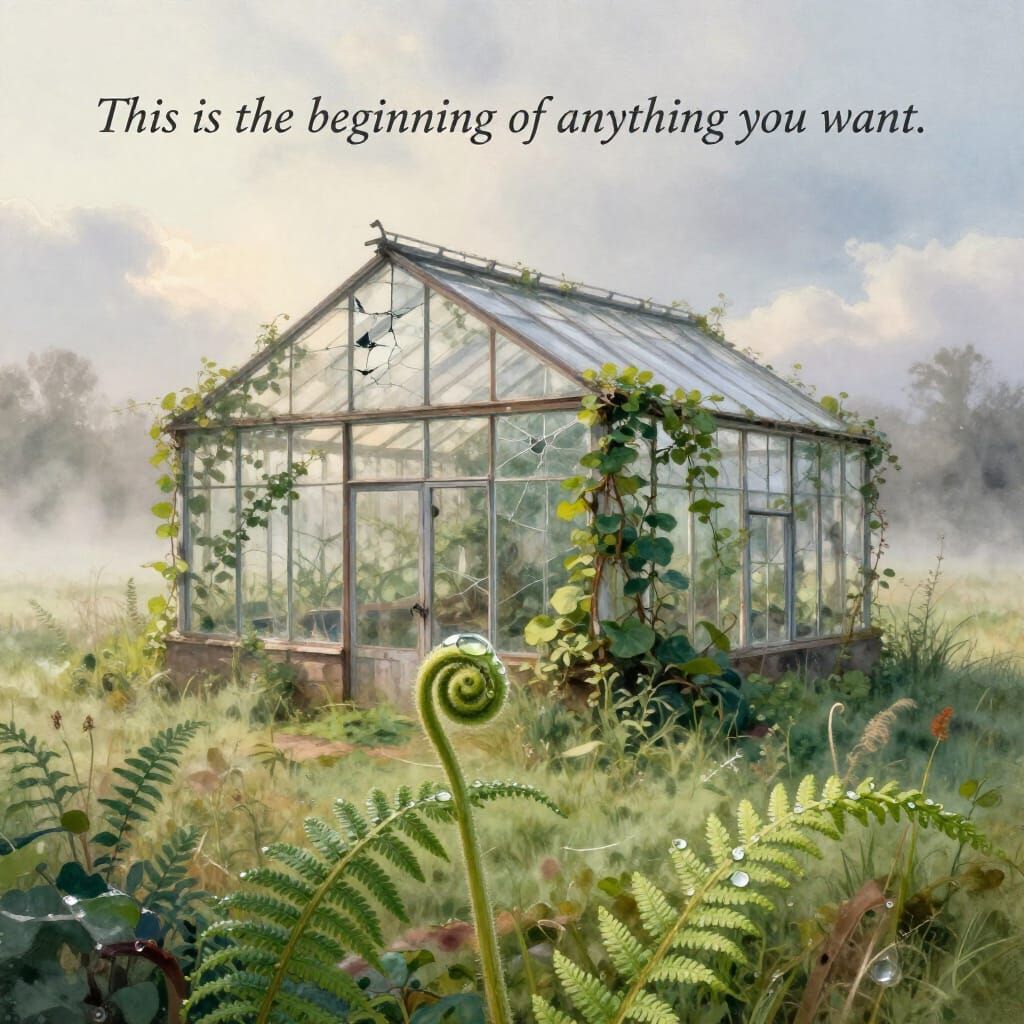 This image shows an abandoned greenhouse overgrown with vines in misty morning light. A dewdrop on a fern symbolizes new beginnings, rendered in a gentle watercolor style with soft brushstrokes.