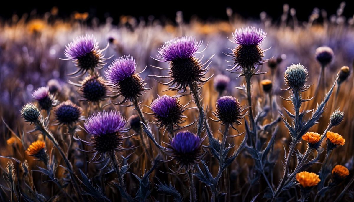 This image showcases a close-up of a thistle meadow under moonlight, with autumn flowers and grasses sparkling with frost. Features purple thistles, red thistle, blue cornflowers, and orange marigolds in a detailed watercolor and ink style.
