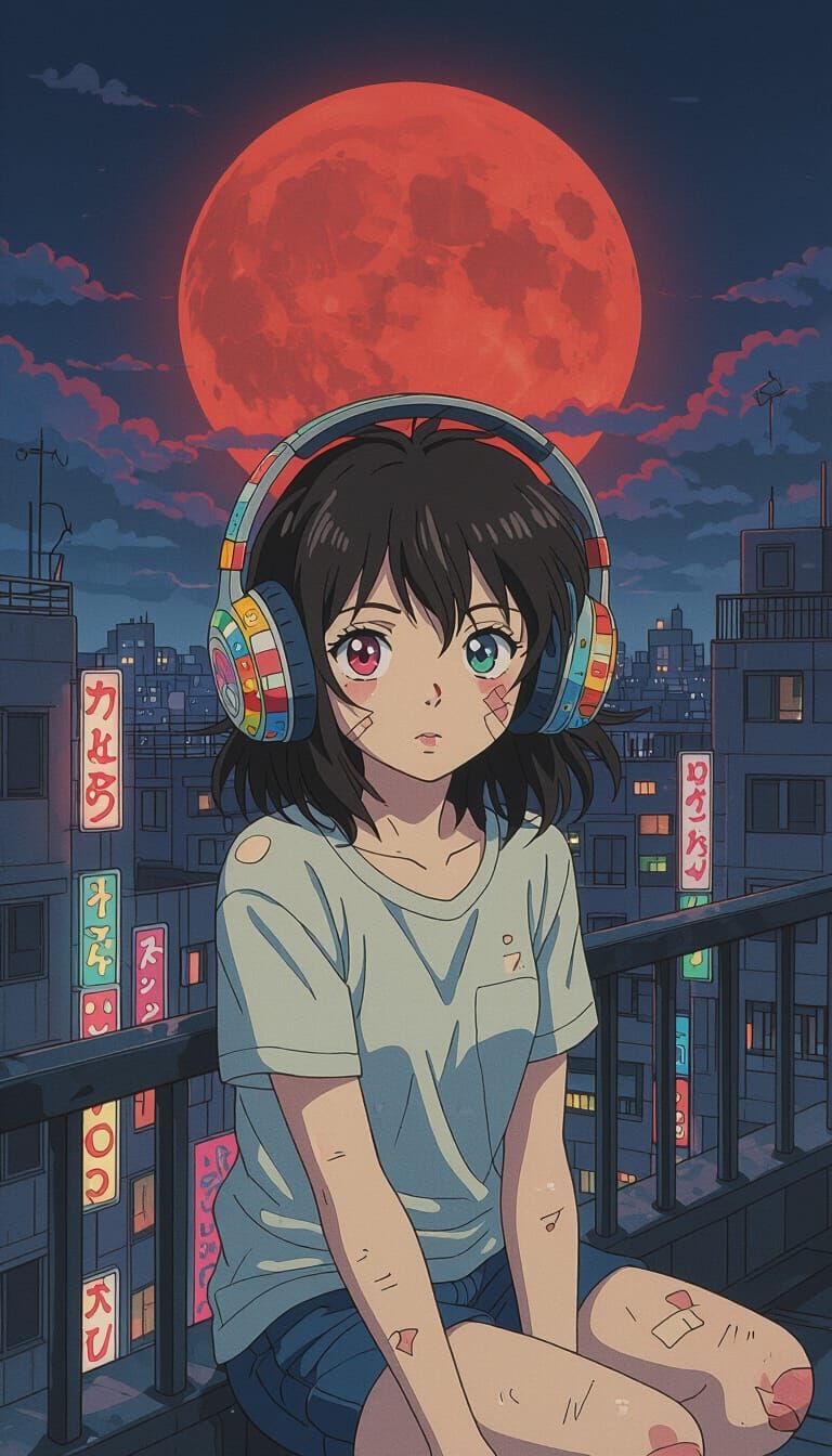 This anime-style portrait shows a girl with messy hair and colorful headphones on a Japanese rooftop. A large red moon hangs over the neon city below, with bandages on her face.