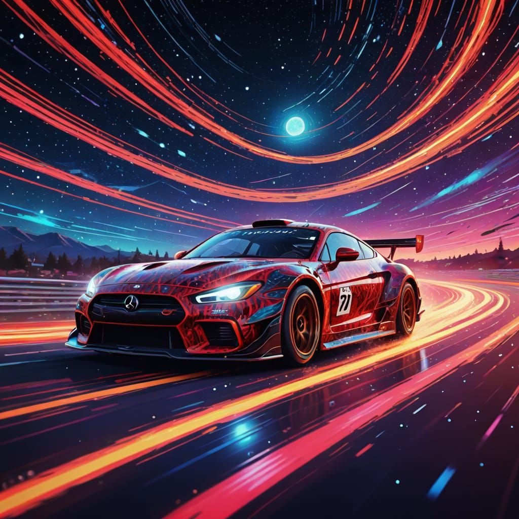 This image shows a race car speeding around a track under a starry night. Glowing astral trails follow the car in a vibrant, detailed, and surreal digital art style.