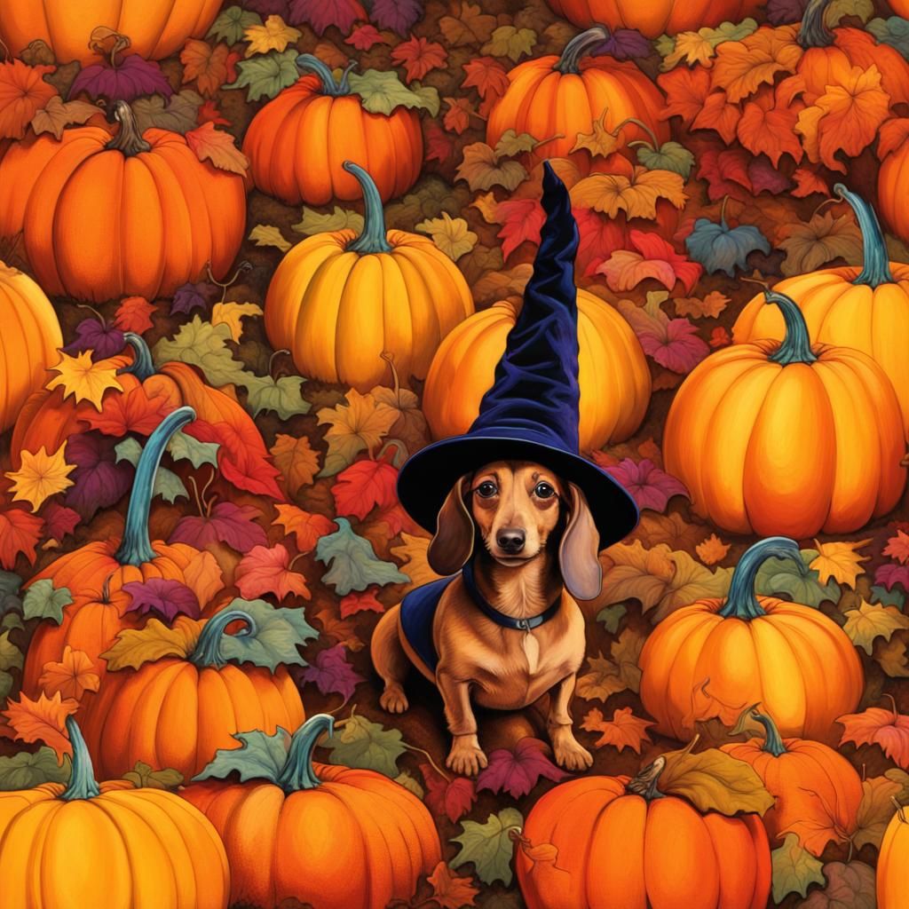 A vibrant image of a dachshund in a hot dog costume and witch's hat in a pumpkin patch. The picture features vibrant Halloween colors, golden lighting, and folk art style.