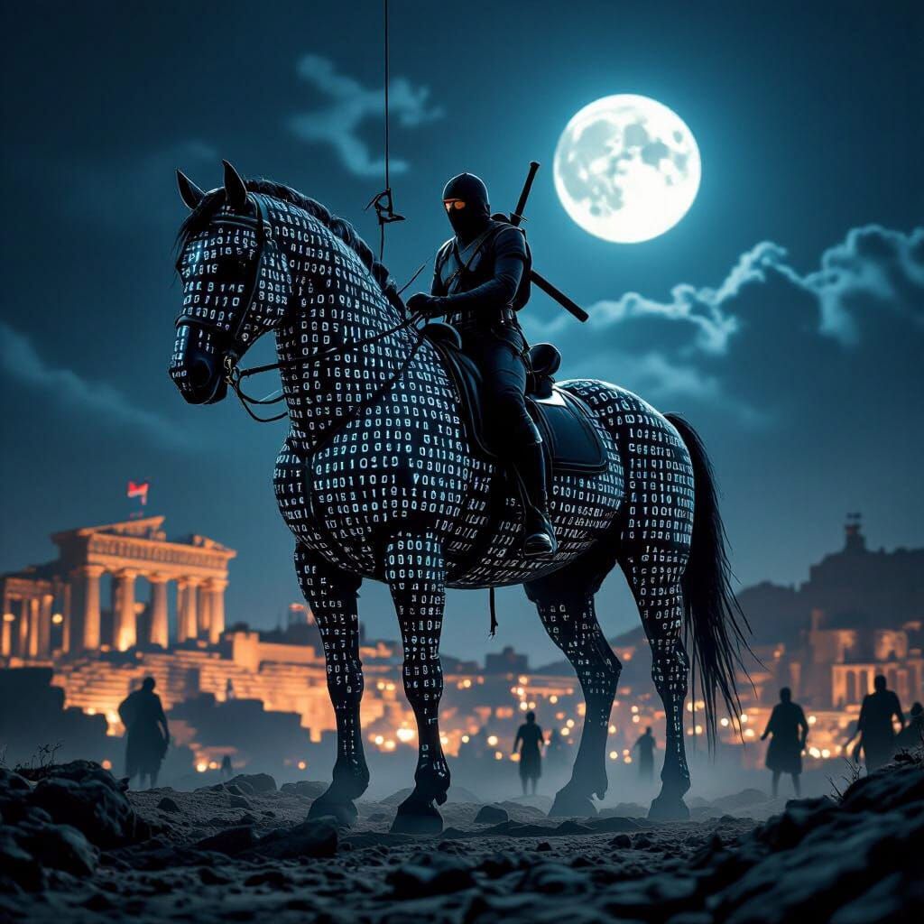A photorealistic Trojan horse covered in binary code stands within the moonlit city of Troy. A ninja descends from its belly. This cinematic image features dramatic lighting, detailed textures, and a dark, atmospheric color palette reminiscent of epic films.