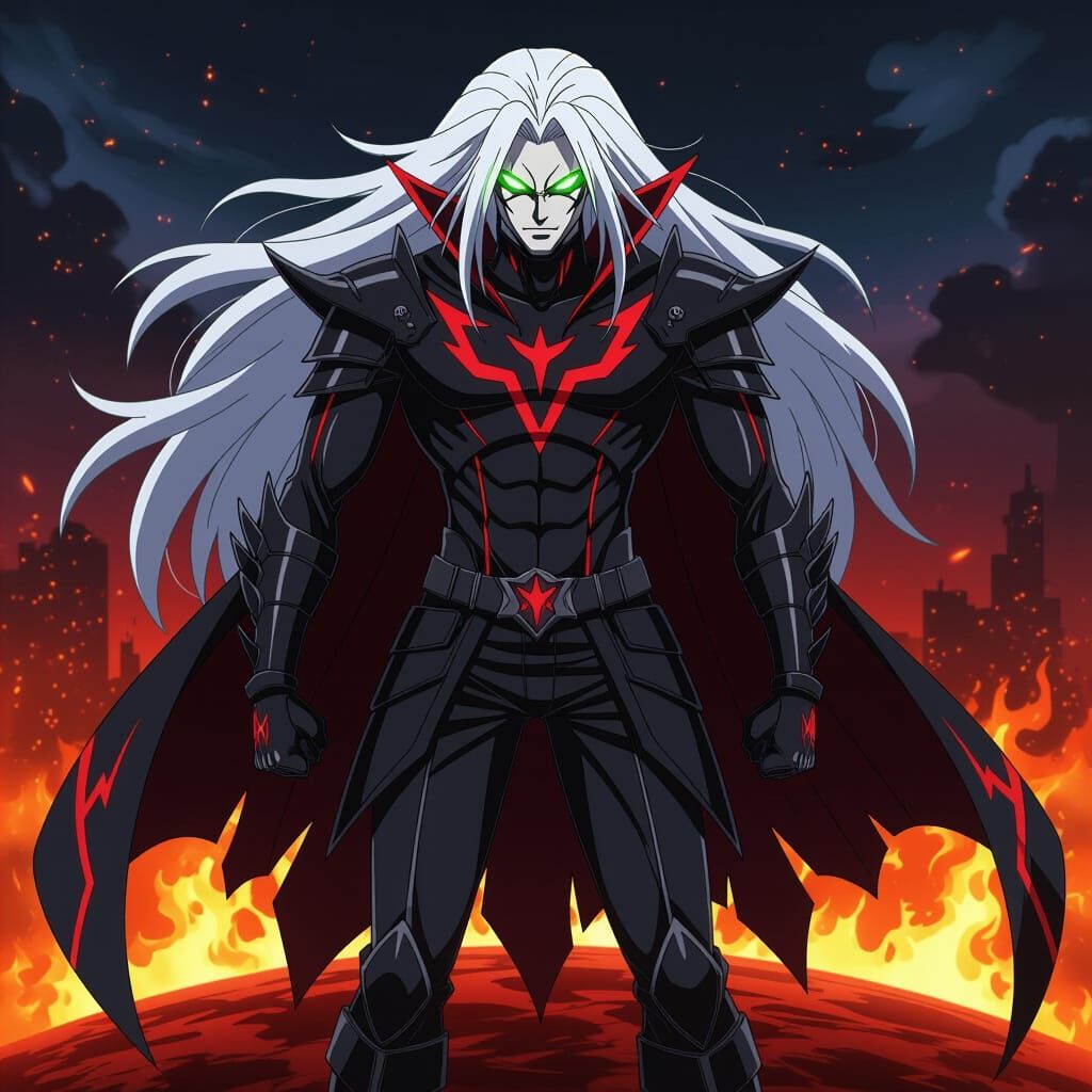 A vivid anime-style image of a villain with white hair and a black and red metallic costume hovering above a burning planet. The villain's costume features sharp edges and a shark emblem.