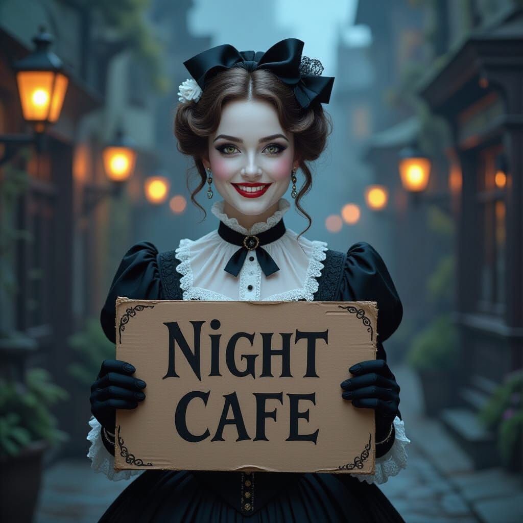 This image shows a woman in a gothic Victorian gown holding a sign that says "Night Cafe". The image blends dark whimsy with fantastical elegance.