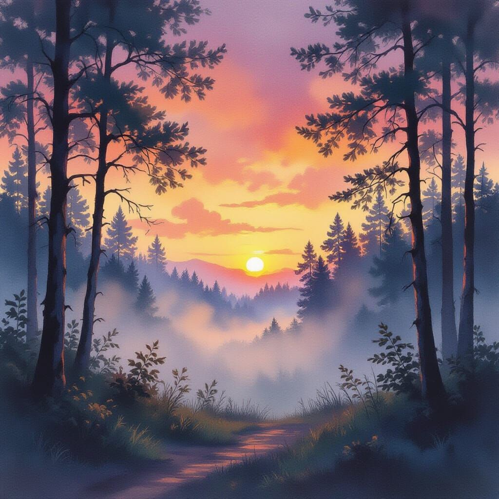 Easily generate your own breathtaking watercolor forest images at dawn with our free AI tool.