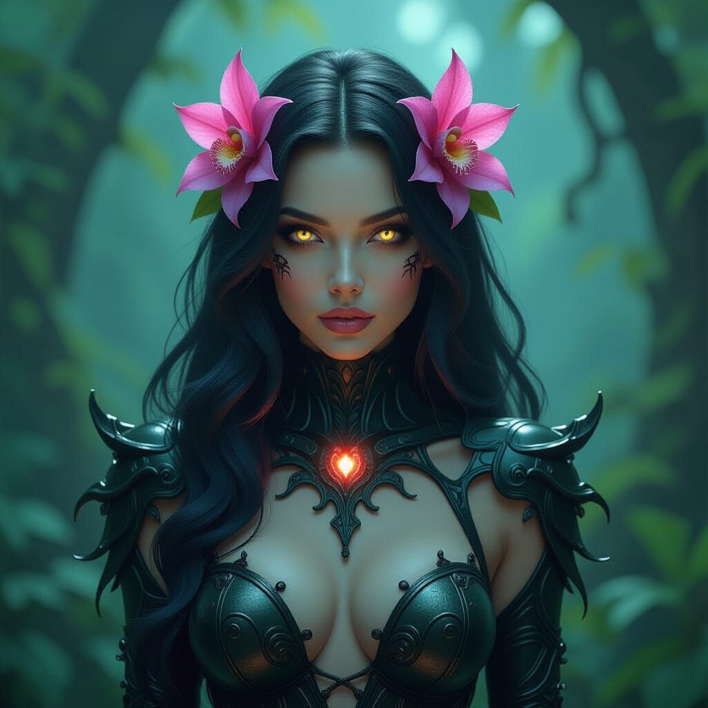 cyber-punk techno-organic Giger's hyperrealistic handsome female nocturnal forest Poison Ivy with glowing eyes. his lithe body highly covered with glowing techno-organic orchids and vines, showing his torso, surreal Lovecraftian surroundings Hyperrealistic, splash art, concept art, mid shot, intricately ...