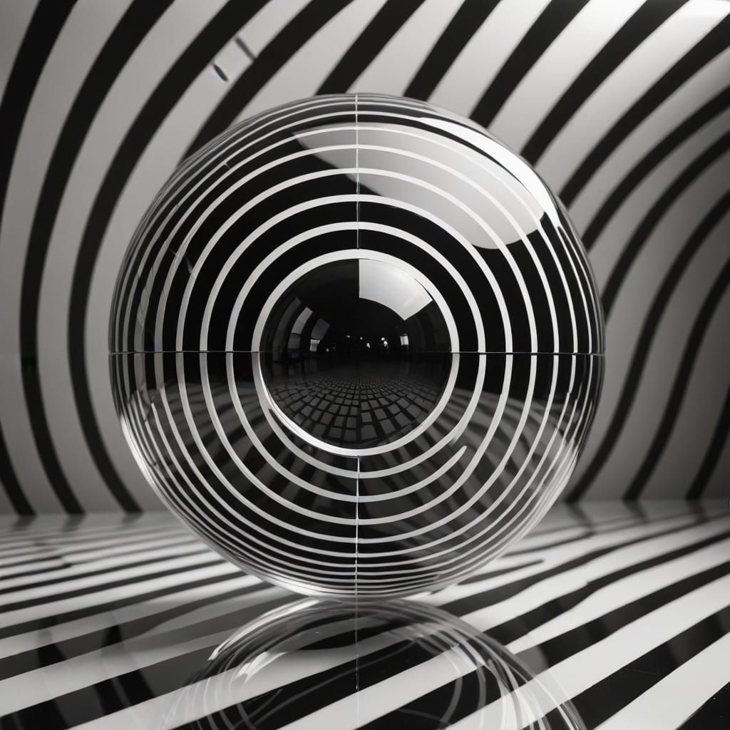 This image shows a striking optical illusion featuring black and white stripes and a solid glass orb, creating a thought-provoking visual puzzle.