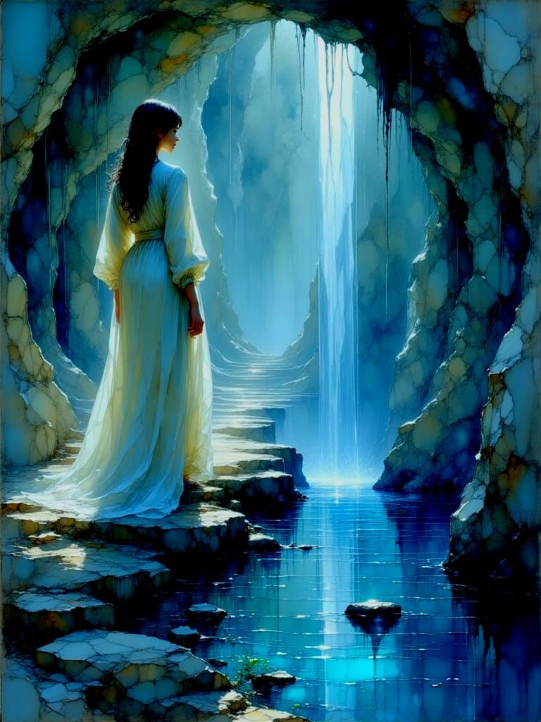 This image shows water bubbling from a white rock in a cave into a pond. The scene is rendered in dark blue tones.