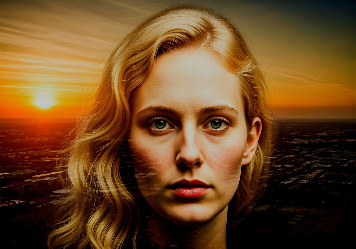 This image features a vintage double exposure blending a face with a landscape, evoking nostalgic memories in golden hour lighting, presented as a magazine print collage.