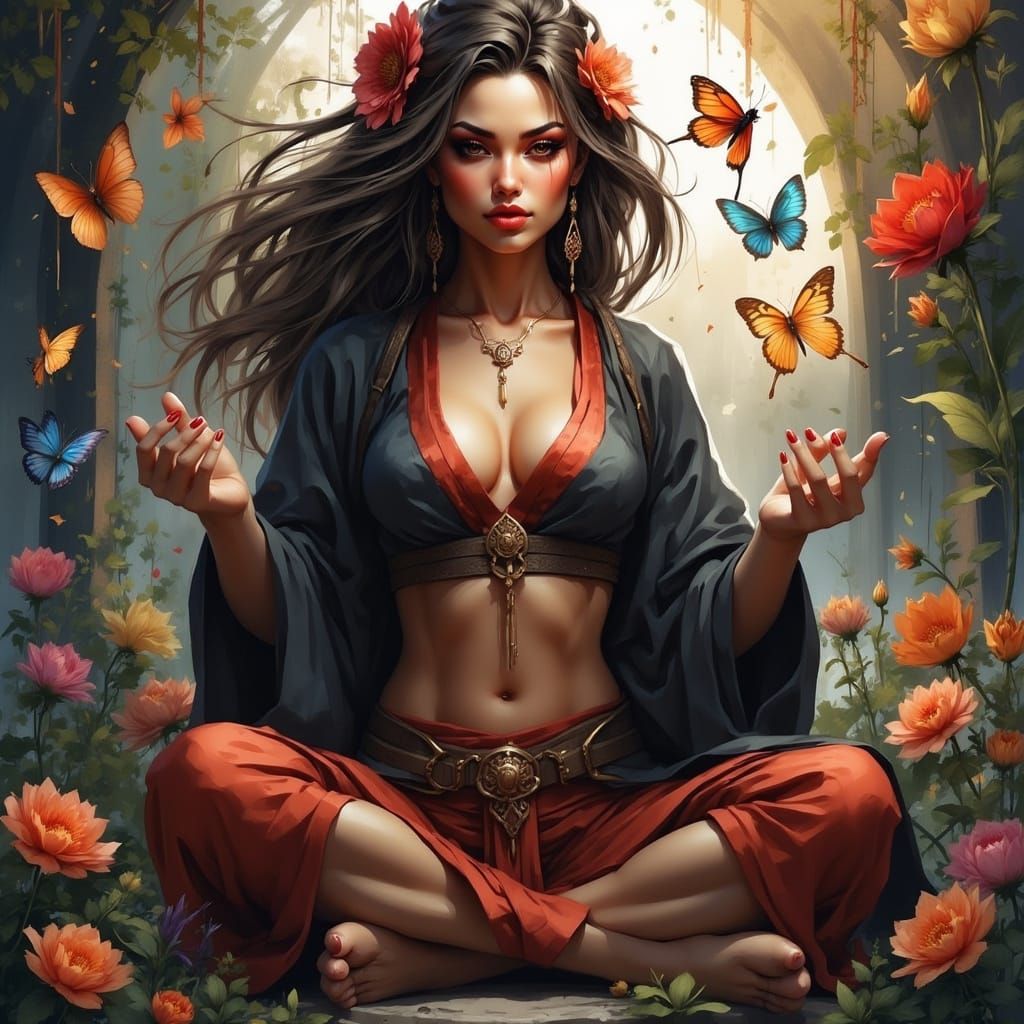 This hyperrealistic image captures a woman meditating in a vibrant zen garden. She has long, flowing hair and wears a black and red kimono with matching nails and lips, surrounded by colorful flowers, birds, and butterflies. The art style features intricate details and dramatic lighting.
