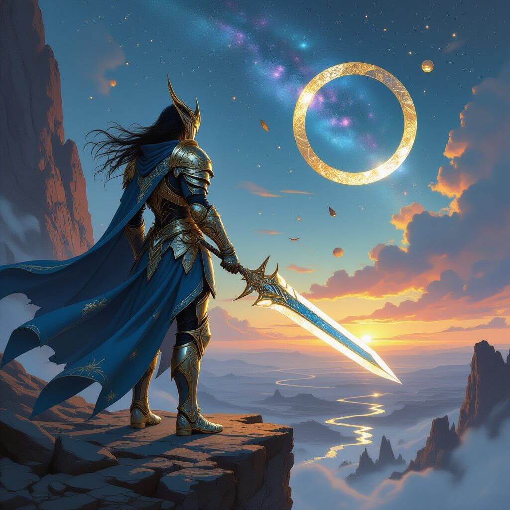 This image shows a celestial warrior in detailed, starlight armor, holding an energy blade. The figure stands on a battle-scarred cliff, surveying a ruined landscape of gold rings and cosmic wreckage, as digital art.