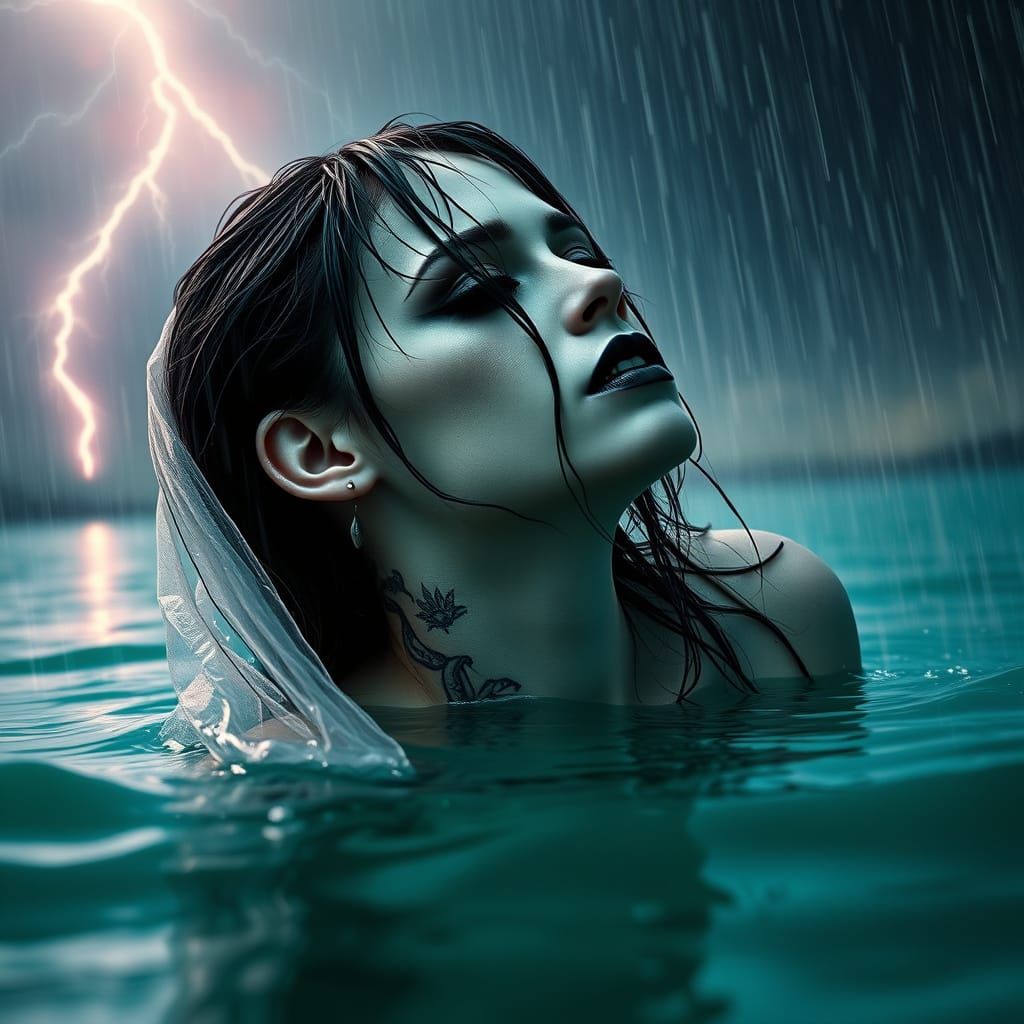 This image features a detailed depiction of a Gothic woman rising from a vibrant lake during a powerful thunderstorm. Lightning illuminates the scene, creating a dramatic and mystical atmosphere.