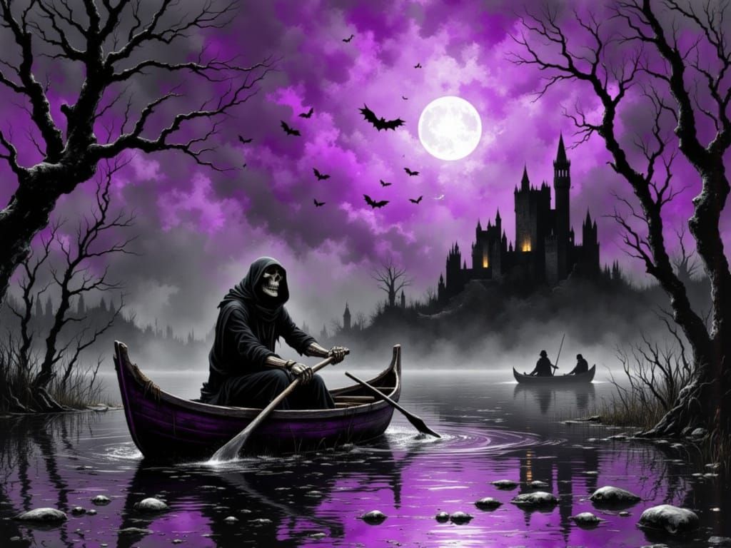 This haunting mixed-media illustration depicts a skeletal ferryman rowing a weathered boat through a dark, twisted swamp, surrounded by eerie mist and illuminated by a ghostly, supernatural glow.