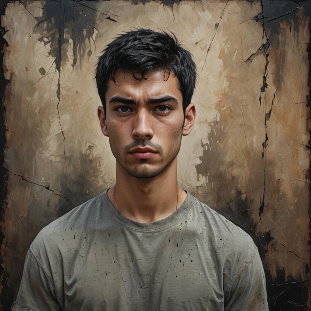 This image shows a hyperrealistic portrait of a stern young college student with short black hair. The digital painting features deep colors and intricate details in a fantasy concept art style.