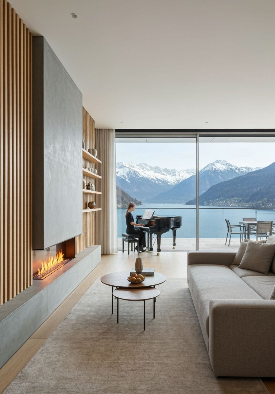 This image shows a modern living room in a lakeside mountain apartment with floor-to-ceiling windows. An elegant woman plays a grand piano, while snow-capped mountains dominate the lake view.